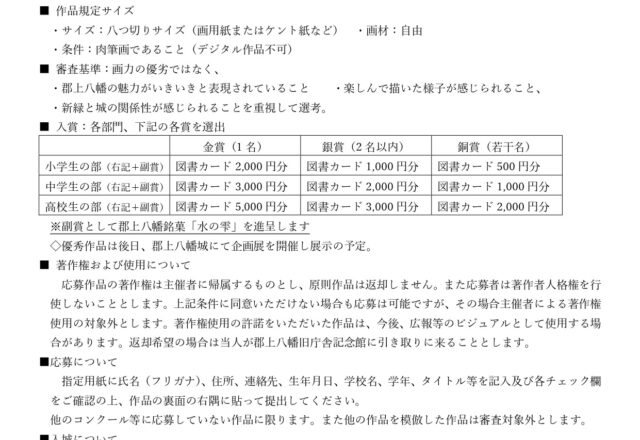 4/29(水祝)~5/24(日)まで郡上八幡城において【積翠城新緑まつり】を開催いたします。 上記の期間中に「新緑の城を描こう!写生大会」を行います。 テーマは「新緑と城」になります。対象は小学生・中学生・高校生となります。 ※市内外の在住は問いません。 応募点数は一人1点までとなります。 サイズは八つ切りで画材は自由です。 ※デジタル作品不可 皆様のご