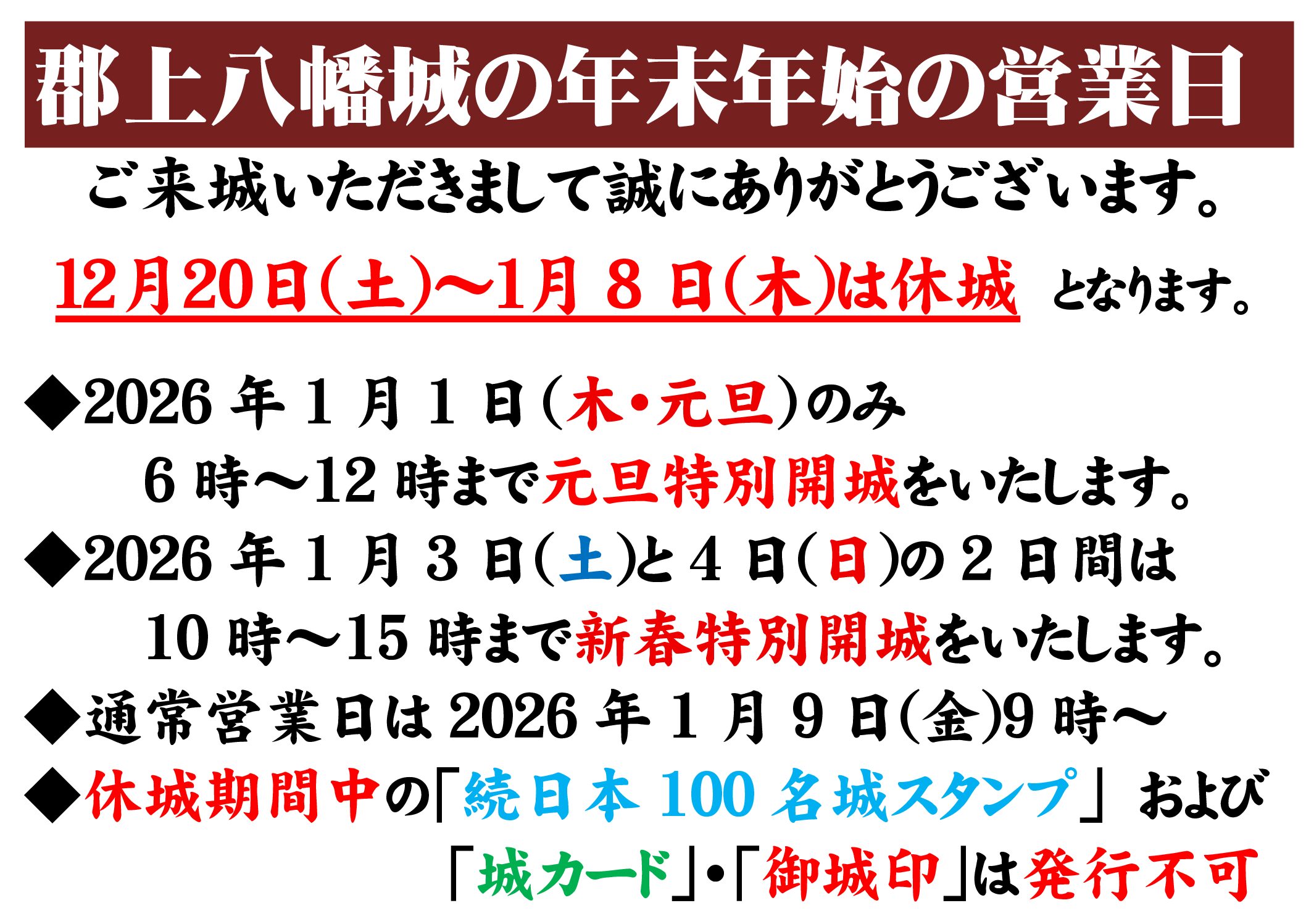 お知らせいつも登城いただきまして誠にありがとうございます。 年末年始の営業につきましてご案内いたします。 年末の営業日:R7年12月19日(金)9時~16時30分(最終受付は16時15分) ※20日(土)から休城になる為、続日本100名城ス...続きを見る