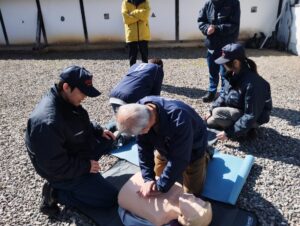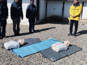 2026.03.12 本日3/12(木) お城での救助者対応訓練を行いました。 できごと 本日3/12(木) お城では、消防署職員が来城して救助者の対応について講習を受けました。 救助者の状況確認および指示出し・意識不明時の胸骨圧迫・AEDの使用方法を習いました! 緊急事態が発生した時にただいま訓練中です。