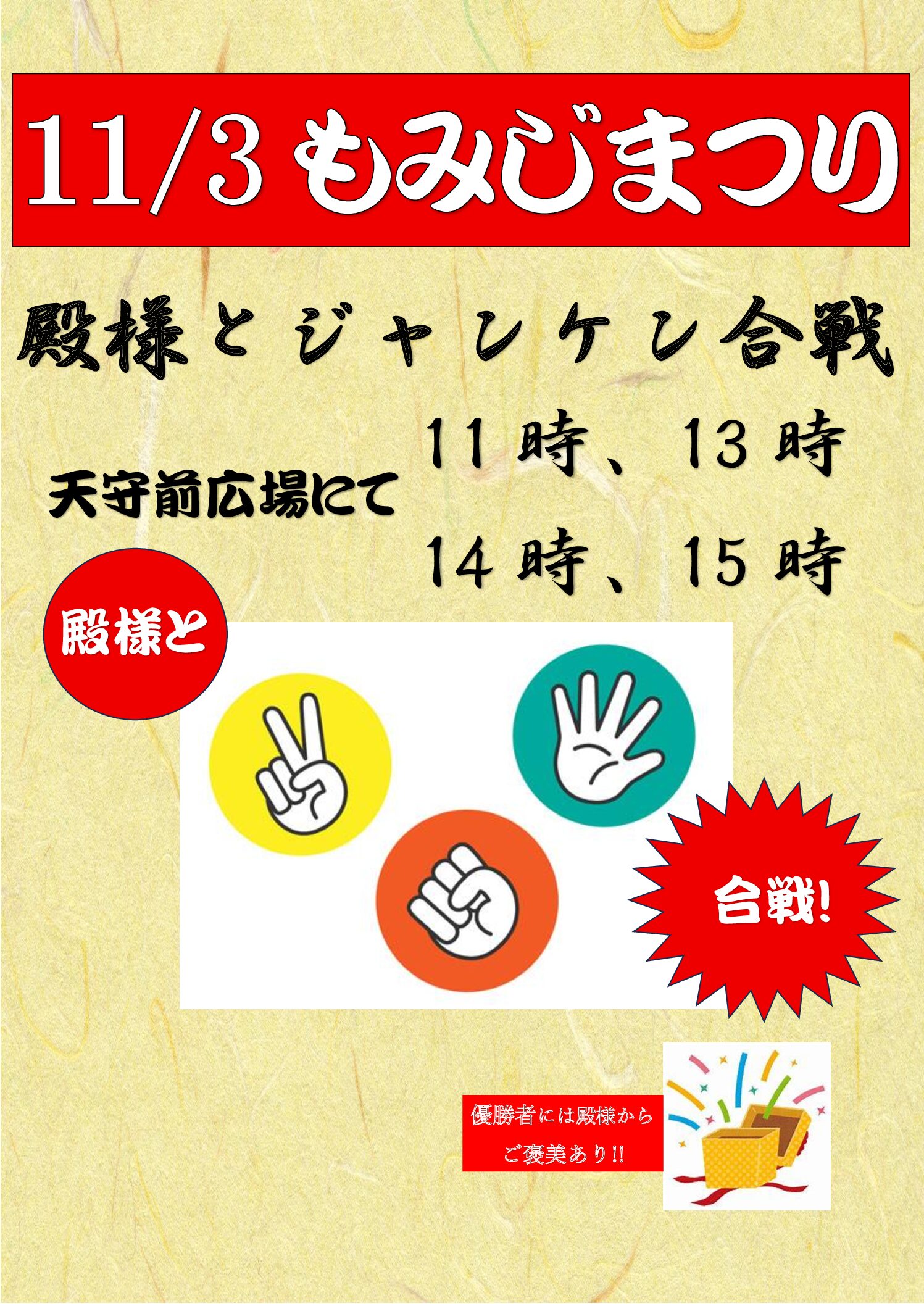 イベントいつも登城いただきまして誠にありがとうございます。 もみじイベント【殿様とジャンケン合戦】につきましてご案内いたします。 開催日:11月3日(月祝) 開催時間:11時、13時、14時、15時 会場:天守前広場 各時間の優勝者には殿...続きを見る