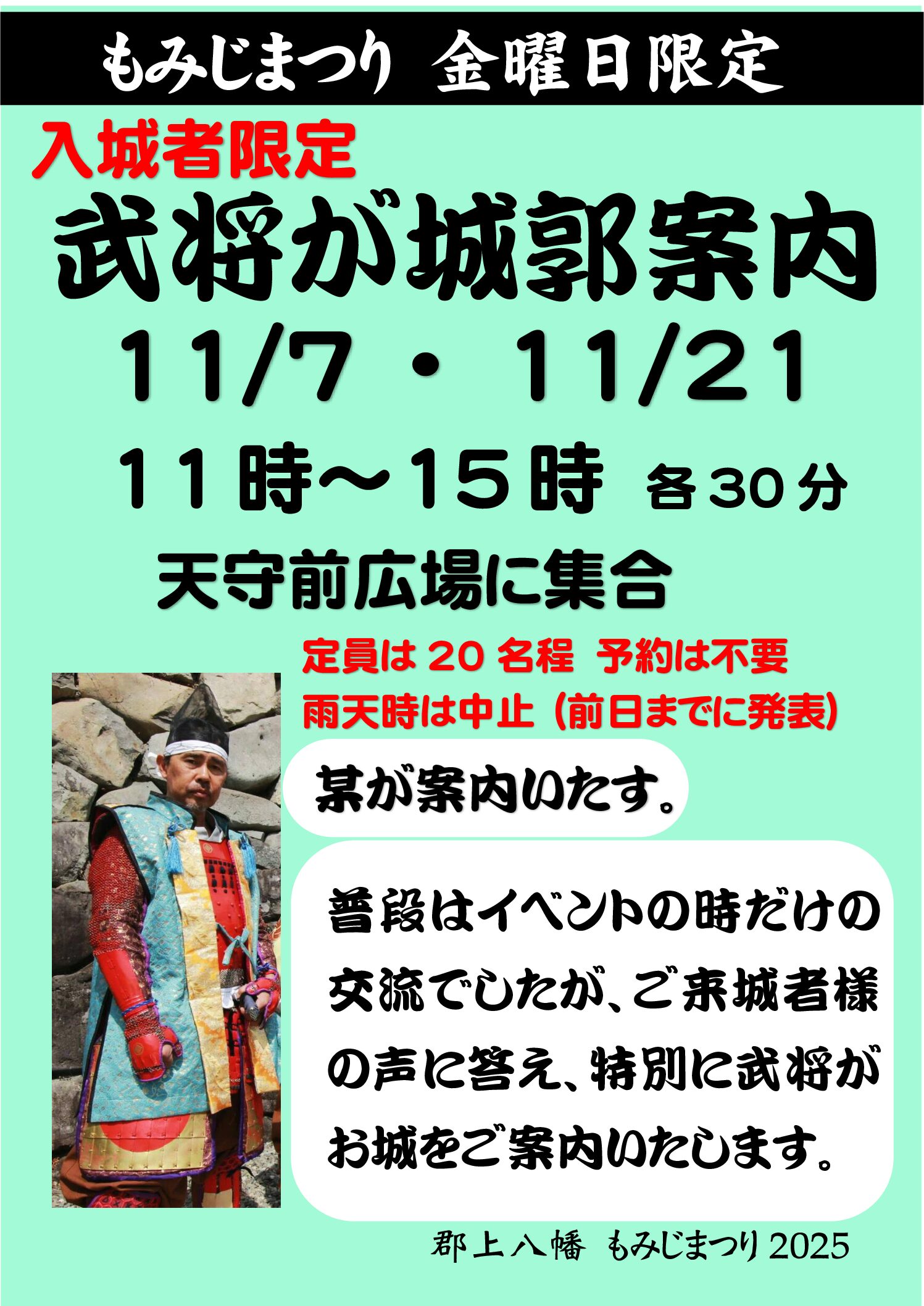 お知らせイベントいつも登城いただきまして誠にありがとうございます。 郡上八幡の秋のイベントをご案内いたします。 2025年11月1日(土)~30日(日)まで郡上八幡もみじまつりを開催いたします。 期間中の土日祝は郡上八幡城にて11時~15時までイベン...続きを見る