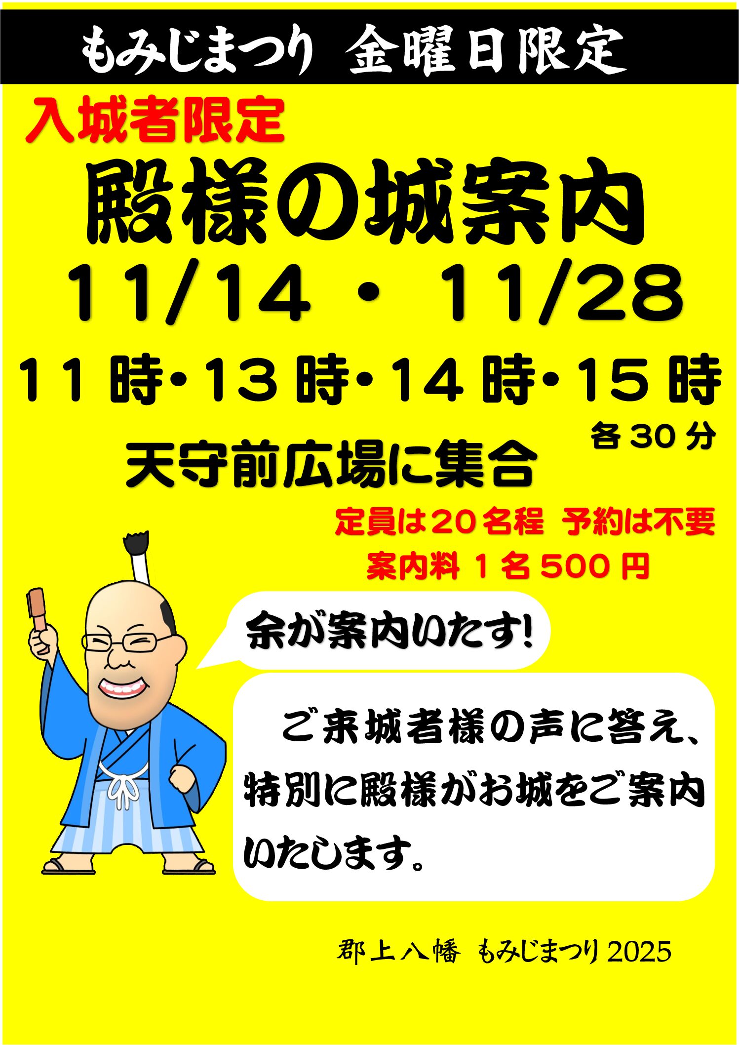 イベントいつも登城いただきまして誠にありがとうございます。 もみじまつりイベント【殿様の城案内】につきましてご案内いたします。 開催日:11月14日(金)・28日(金) 開催時間:11時・13時・14時・15時 各30分 会場:天守前広場に...続きを見る